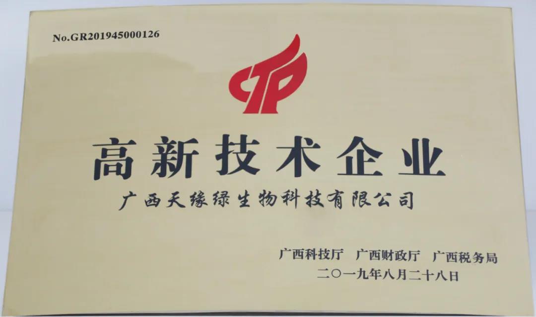 2022年10月,廣西天緣綠生物科技有限公司再次通過“國家高新技術(shù)企業(yè)”認(rèn)定